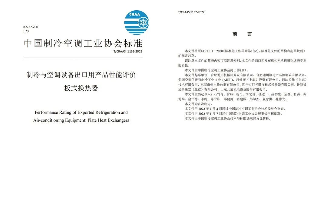 2022年06月07日根據中國制冷空調工業協會團體標準制定計劃,由THT巨元參與起草的中國制冷空調工業協會標準 T/CRAAS 1132-2022《制冷與空調設備出口用產品性能評價 板式換熱器》經中國制冷空調工業協會審查批準并發布,自2022年7月1日起施行。該標準的發布旨在更好的幫助制造商理解美標